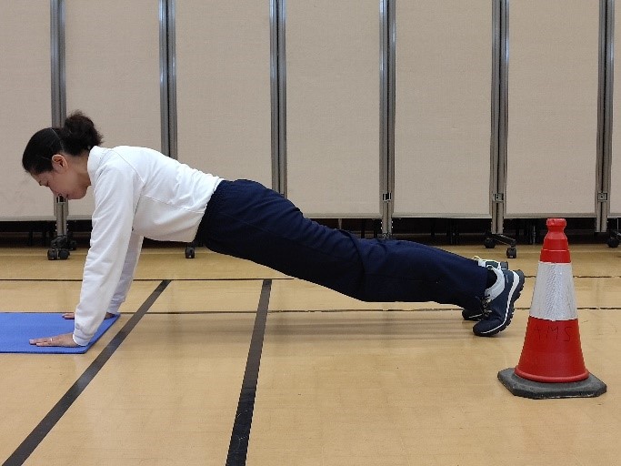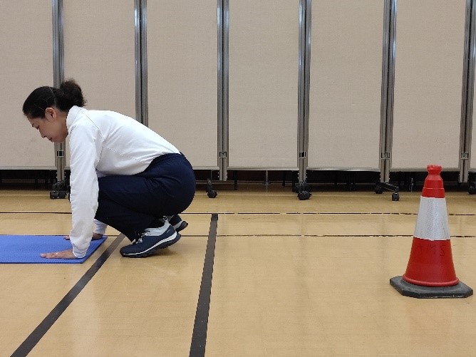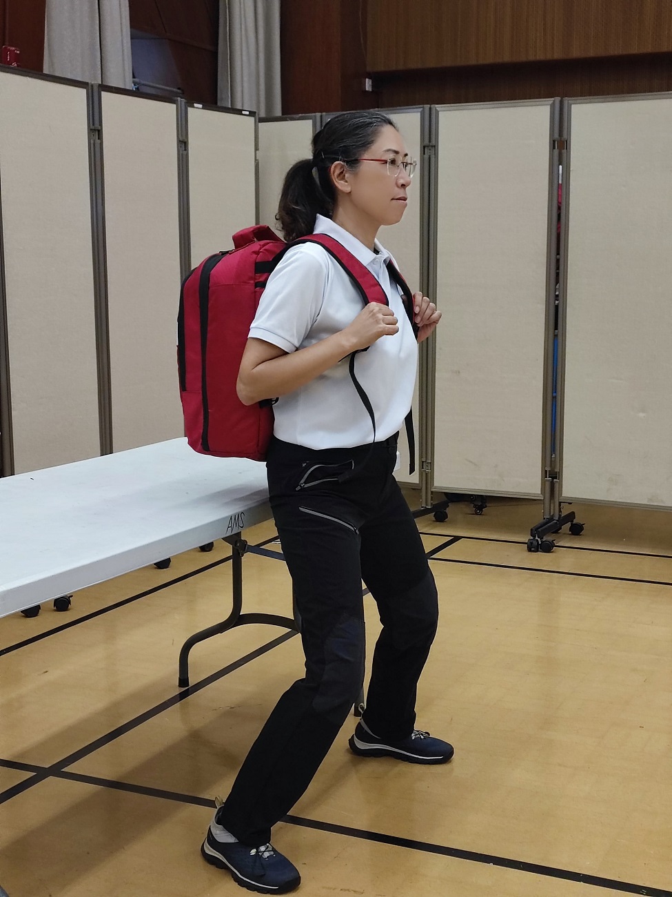 | 2. | 100-meter run or walk with first aid rucksack in 1 minute | Follow the steps below and wear a first aid rucksack currently in use by the Auxiliary Medical Service (about 6.2 kg). Run or walk 100 meters in 1 minute. (1) Slightly bend your knees and keep your back straight; (2) Tighten the shoulder straps so that the rucksack stays close to your back |